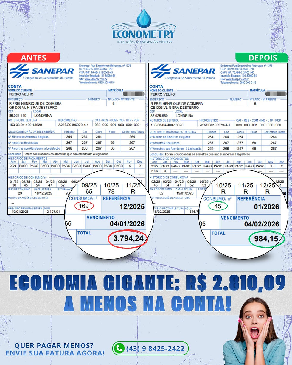 💰 Isso significa R$ 2.810,09 de economia, ou seja, uma queda de 74% no valor da conta de água!